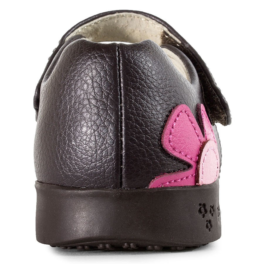• Chocolate leather mary janes with multi-color colorway and appliqué flowers