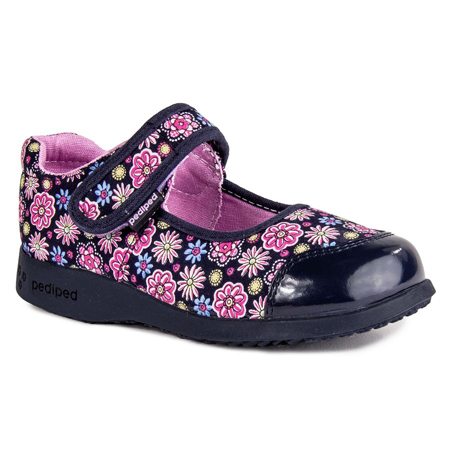 • Navy mary jane in casual corduroy with colourful floral mottle