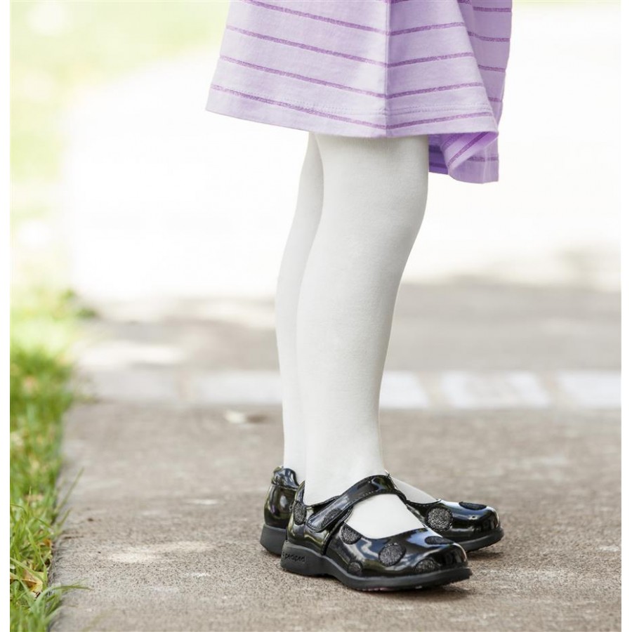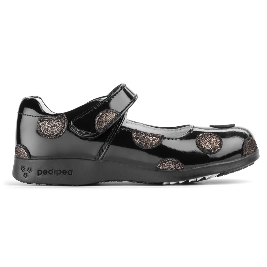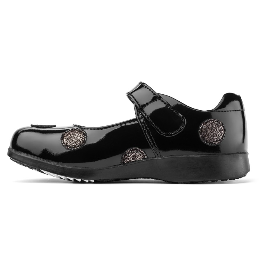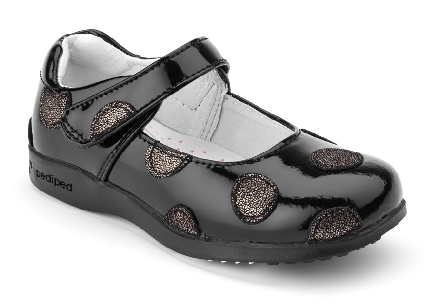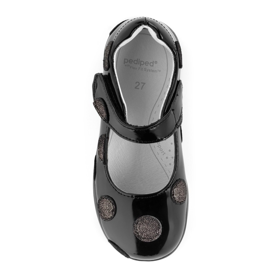 • Black patent leather mary janes embellished with polka dots for an elegant look