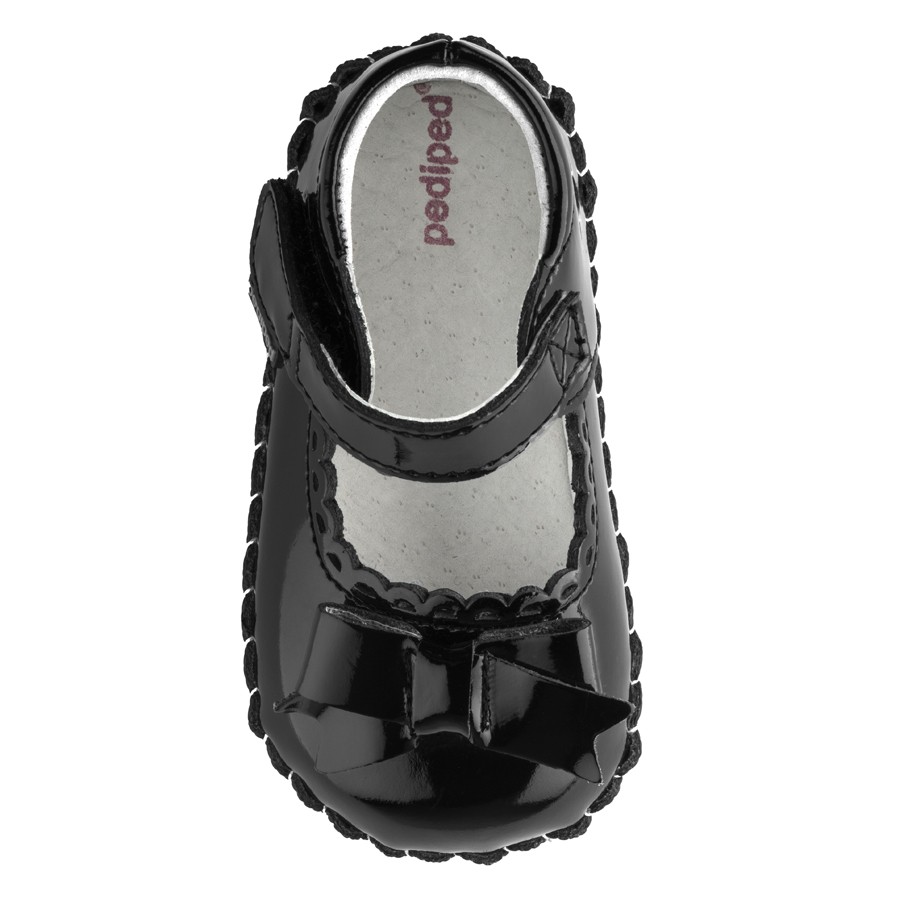 • Black patent leather mary janes embellished with matching bow